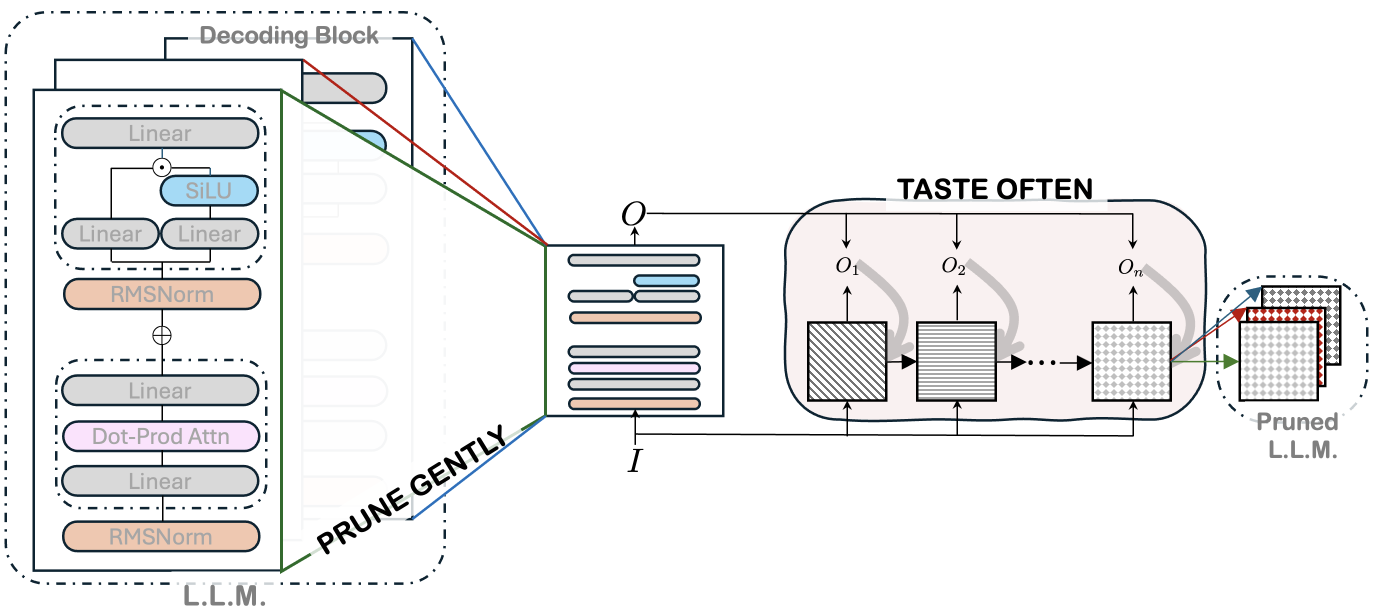 We liken our approach to the way an expert chef spices a complex dish. In cooking, spices are easy to overlook and hard to add at the right moment and even risky, if handled poorly. One simply cannot add a heap of tarragon, pepper, and salt at the beginning (pruning-aware training) or at the end (layer-wide pruning) and expect to have the same results as if spices had been added carefully throughout. Similarly, our approach finds a balance between two extremes. Pruning block by block, as we do, is more like spicing a dish throughout the process. Hence the motto of our approach: Prune Gently, Taste Often.