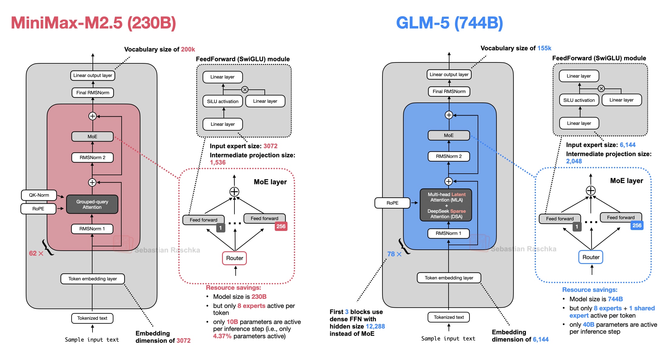 Architecture-wise, MiniMax M2.5 is a 230B model with a fairly classic design: just plain Grouped Query Attention, no sliding window attention or other efficiency improvements.