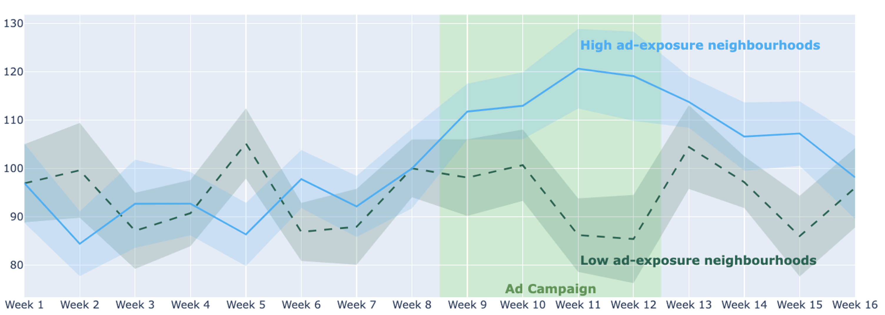 This radically simple approach produces strikingly clear results: over the course of a four-week ad campaign, the high-ad-exposure neighborhoods saw a measurable increase in sales versus neighborhoods with low exposure.