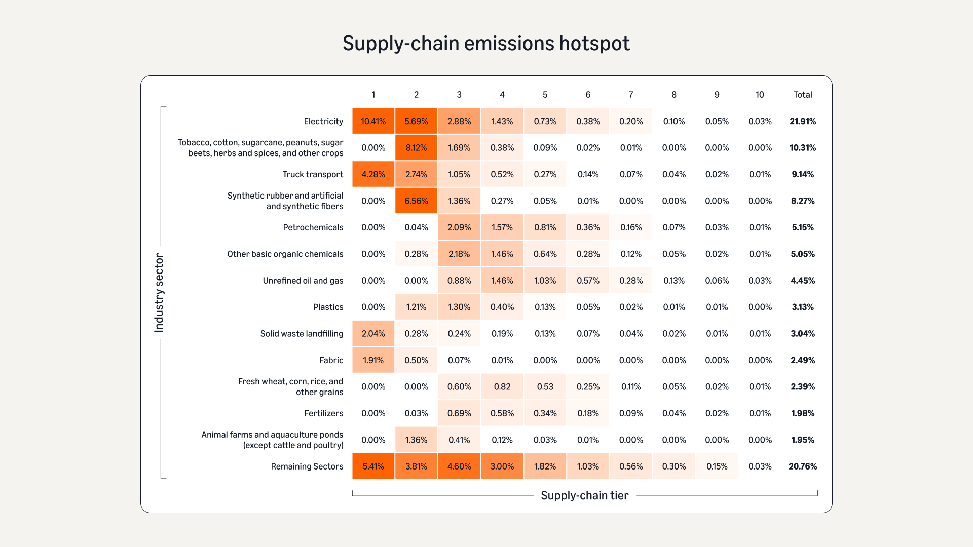 Traditional spend-based emission factors let companies measure the total carbon footprint of their supply chain and identify emissions at the level of industrial sectors. However, this high-level, aggregate overview can hide emissions that occur deeper within supply chains and can limit insights into how or where specific actions or technologies can be applied to best address decarbonization.