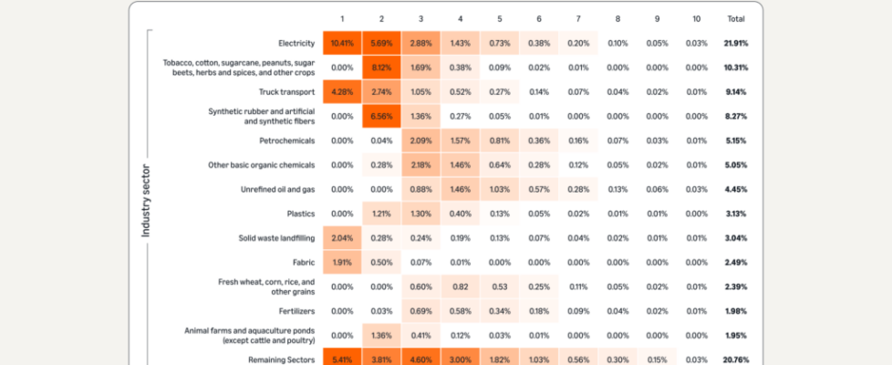 Called supply-chain decomposition, our approach applies a mathematical technique known as a power-series expansion to the matrix used to create the EEIO dataset. Whereas the traditional Leontief-inverse operation collapses the complex, multilayered nature of supply chains into a simplified overview, a power-series expansion preserves the structure of the intricate web of relationships between different industries and production stages. When combined with the same environmental data as before, it creates spend-based emission factors that reveal the detailed connections between industries and tiers of the supply chain that were hidden in the aggregate view. The result is a freely available dataset with significantly more nuanced data that lets companies drill down into their Scope 3 emissions.
