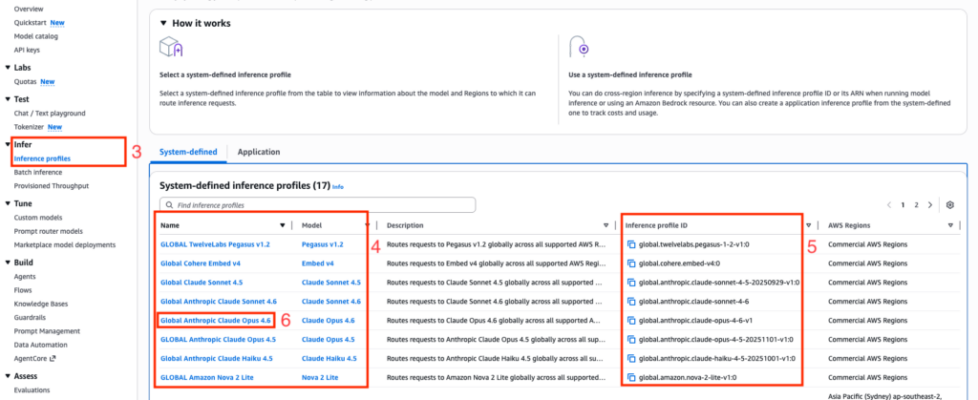 global. - The model ID to invoke models via global CRIS is obtained via the corresponding Inference profile ID column from the System-defined inference profiles table. At the time of writing this blog post, it supports Anthropic Claude Opus 4.6, Claude Sonnet 4.6, Claude Haiku 4.5, and other foundation models.