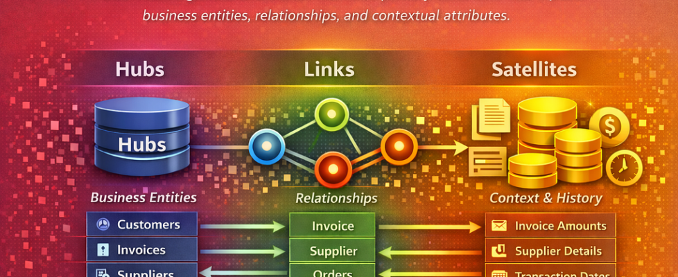 Data Vault is a data modeling methodology designed to support scalable, auditable, and flexible enterprise data warehouses. Instead of consolidating all information into a single wide table or heavily normalized relational schema, Data Vault organizes information into three primary constructs: Hubs, Links, and Satellites. Each construct plays a specific role in representing business entities, their relationships, and their contextual attributes.