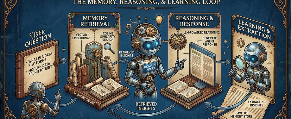 We have now built a simple domain expert agent that demonstrates how reasoning, memory, and learning can be combined in a lightweight architecture. The agent answers questions about data and analytics architecture, extracts useful insights from its responses, and stores those insights so they can be retrieved and used during future interactions .