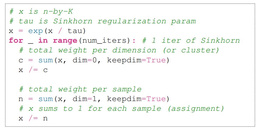 Details on the Softmax(batch) variant. The itera-tive Sinkhorn-Knopp algorithm [17] used in SwAV [10] is implemented simply with the following PyTorch style code.