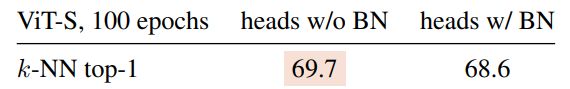 Therefore, when applying DINO to ViT we do not use any BN also in the projection heads. In this table we evaluate the impact of adding BN in the heads. We observe that adding BN in the projection heads has little impact, showing that BN is not important in our framework. Overall, when applying DINO to ViT, we do not use any BN anywhere, making the system entirely BN-free. This is a great advantage of DINO + ViT to work at state-of-the-art performance without requiring any BN. Indeed, training with BN typically slows down trainings considerably, especially when these BN modules need to be synchronized across processes [33, 10, 9, 30].