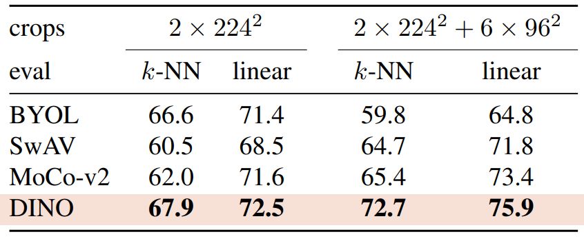 The effectiveness of multi-crop depends on the considered framework, which positions multi-crop as a core component of a model and not a simple “add-ons” that will boost any framework the same way. Without multi-crop, DINO has better accuracy than other frameworks, though by a moderate margin (1%). Remarkably, DINO benefits the most from multi-crop training (+3.4% in linear eval). Interestingly, we also observe that the ranking of the frameworks depends on the evaluation protocol considered.