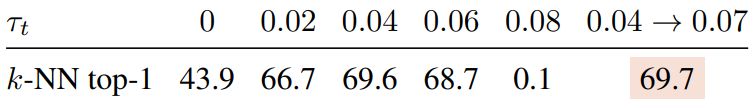 Sharpening. We enforce sharp targets by tuning the teacher softmax temperature parameter τt. In this table, we observe that a temperature lower than 0*.06 is required to avoid collapse. When the temperature is higher than 0.06, the training loss consistently converges to ln(K). However, we have observed that using higher temperature than 0.06 does not collapse if we start the training from a smaller value and increase it during the first epochs. In practice, we use a linear warm-up for τt from 0.04 to 0.*07 during the first 30 epochs of training. Finally, note that τ → 0 (extreme sharpening) correspond to the argmax operation and leads to one-hot hard distributions.
