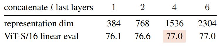 ViT-S representations for linear eval. Following the feature-based evaluations in BERT [18], we concatenate the [CLS] tokens from the l last layers. We experiment with the concatenation of a different number l of layers and similarly to [18] we find l = 4 to be optimal.
