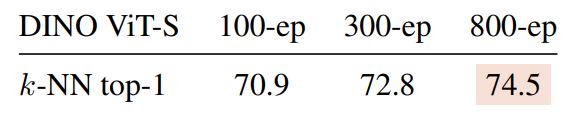 Longer training. We observe in this table that longer train-ing improves the performance of DINO applied to ViT-Small. This observation is consistent with self-supervised results obtained with convolutional architectures [12]. We note that in our experiments with BYOL on ViT-S, training longer than 300 epochs has been leading to worse performance com-pare our 300 epochs run. For this reason we report BYOL for 300 epochs in Tab. 2 while SwAV, MoCo-v2 and DINO are trained for 800 epochs.