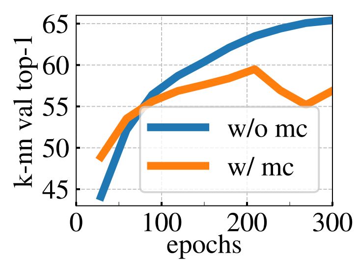 Figure 6: Top-1 accuracy on ImageNet validation with k-NN classifier. (left) Comparison between the performance of the momentumteacher and the student during training. (right) Comparison between different types of teacher network. The momentum encoder