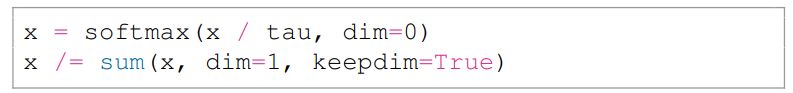 When performing a single Sinkhorn iteration (num iters=1) the implementation can be highly simplified into only two lines of code, which is our softmax(batch) variant: