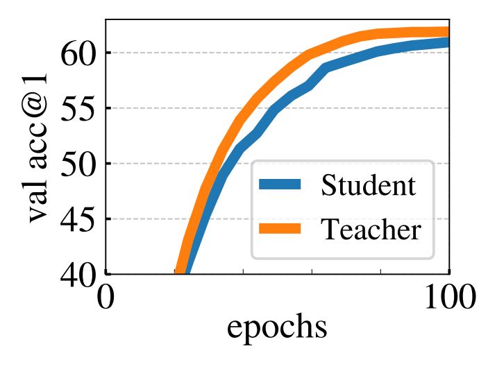 The teacher outperforms the student. We have shown in Fig. 6 that the momentum teacher outperforms the student with ViT and we show in this Figure that it is also the case with ResNet-50. The fact that the teacher continually out-performs the student further encourages the interpretation of DINO as a form of Mean Teacher [65] self-distillation. In-deed, as motivated in Tarvainen et al. [65], weight averaging usually produces a better model than the individual models from each iteration [51]. By aiming a target obtained with a teacher better than the student, the student’s representations improve. Consequently, the teacher also improves since it is built directly from the student weights.