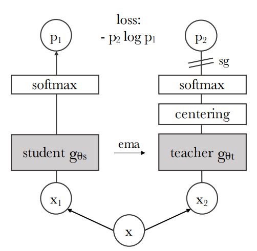Figure 2: Self-distillation with no labels. We illustrate DINO in the case of one single pair of views (x1, x2) for simplicity. The model passes two different random transformations of an input image to the student and teacher networks. Both networks have the same architecture but different parameters. The output of the teacher network is centered with a mean computed over the batch. Each networks outputs a K dimensional feature that is normalized with a temperature softmax over the feature dimension. Their similarity is then measured with a cross-entropy loss. We apply a stop-gradient (sg) operator on the teacher to propagate gradients only through the student. The teacher parameters are updated with an exponential moving average (ema) of the student parameters.