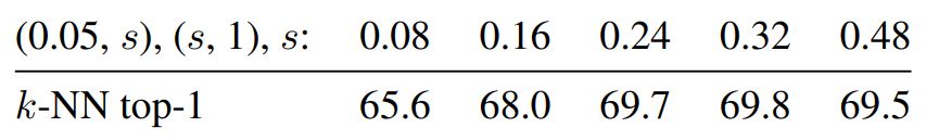 Range of scales in multi-crop. For generating the different views, we use the RandomResizedCrop method from torchvision.transforms module in PyTorch. We sample two global views with scale range (s, 1) before resizing them to 2242 and 6 local views with scale sampled in the range (0*.05, s*) resized to 962 pixels. Note that we arbitrarily choose to have non-overlapping scaling range for the global and local views following the original design of SwAV. However, the ranges could definitely be overlapping and experimenting with finer hyperparameters search could lead to a more optimal setting. In this table, we vary the pa-rameter s that controls the range of scales used in multi-crop and find the optimum to be around 0*.3 in our experiments. We note that this is higher than the parameter used in SwAV which is of 0.*14.