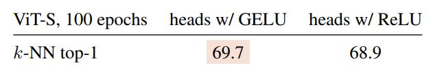 GELU activations. By default, the activations used in ViT are gaussian error linear units (GELU). Therefore, for consistency within the architecture, we choose to use GELU also in the projection head. We evaluate the effect of using ReLU instead of GELU in this table and observe that changing the activation unit to ReLU has relatively little impact.