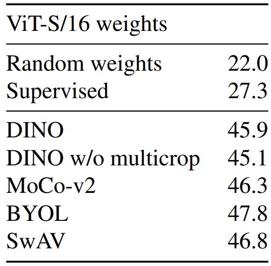 Table 6: Transfer learning by finetuning pretrained models on different datasets. We report top-1 accuracy. Self-supervisedpretraining with DINO transfers better than supervised pretraining.