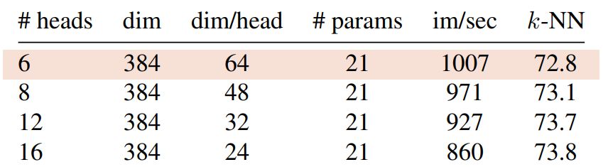 Table 1: Networks configuration. “Blocks” is the number of Transformer blocks, “dim” is channel dimension and “heads” is the number of heads in multi-head attention. “# tokens” is the length of the token sequence when considering 2242 resolution inputs, “# params” is the total number of parameters (without counting the projection head) and “im/s” is the inference time on a NVIDIA V100 GPU with 128 samples per forward.