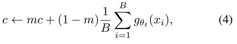 Avoiding collapse. Several self-supervised methods dif-fer by the operation used to avoid collapse, either through contrastive loss [73], clustering constraints [8, 10], predic-tor [30] or batch normalizations [30, 58]. While our frame-work can be stabilized with multiple normalizations [10], it can also work with only a centering and sharpening of the momentum teacher outputs to avoid model collapse. As shown experimentally in Section 5.3, centering prevents one dimension to dominate but encourages collapse to the uniform distribution, while the sharpening has the oppo-site effect. Applying both operations balances their effects which is sufficient to avoid collapse in presence of a momen-tum teacher. Choosing this method to avoid collapse trades stability for less dependence over the batch: the centering operation only depends on first-order batch statistics and can be interpreted as adding a bias term c to the teacher: gt(x) ← gt(x) + c. The center c is updated with an expo-nential moving average, which allows the approach to work well across different batch sizes as shown in Section 5.5: