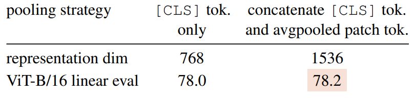 ViT-B representations for linear eval. With ViT-B we did not find that concatenating the representations from the last l layers to provide any performance gain, and consider the final layer only (l = 1). In this setting, we adapt the pipeline used in convnets with global average pooling on the output patch tokens. We concatenate these pooled features to the final [CLS] output token.
