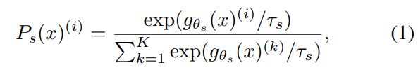 with τs > 0 a temperature parameter that controls the sharpness of the output distribution, and a similar formula holds for Pt with temperature τt.