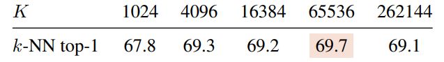 Output dimension. In this table, we evaluate the effect of varying the output dimensionality K. We observe that a large output dimensionality improves the performance. We note that the use of l2-normalization bottleneck permits to use a large output dimension with a moderate increase in the total number of parameters. Our default is to use K equals to 65536 and d = 256 for the bottleneck.