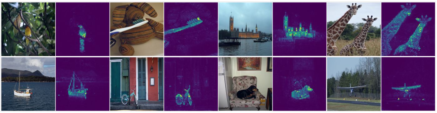 Figure 1: Self-attention from a Vision Transformer with 8 × 8 patches trained with no supervision. We look at the self-attention of the [CLS] token on the heads of the last layer. This token is not attached to any label nor supervision. These maps show that the model automatically learns class-specific features leading to unsupervised object segmentations.