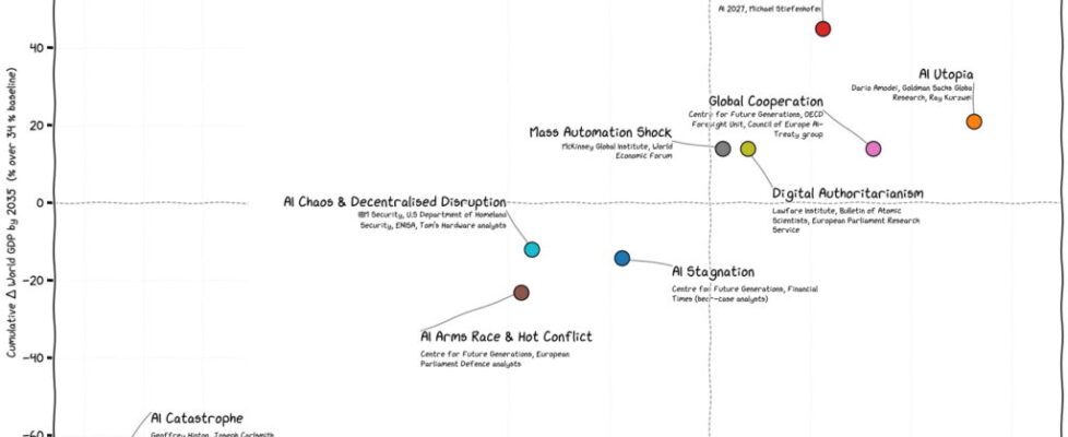 Here is an illustrative plot of various potential scenarios for the next decade that people had predicted. (The GDP and life expectancy numbers are just illustrative- these were not explicitly predicted by the cited people, but are o3’s interpretations of the scenarios, see appendix below.)