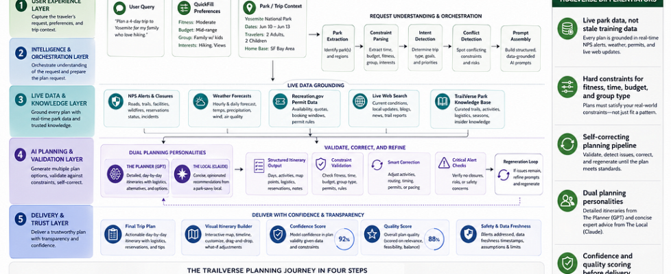 That realization shaped how I built TrailVerse. This is the engineering story of how I went from a basic chat wrapper to a pipeline that parses your constraints, validates them against live data, detects contradictions in what you’re asking for, scores its own output, and regenerates when it isn’t confident enough — all before you see a single word.