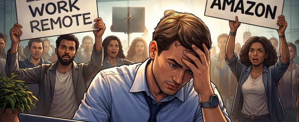 IMAGE: A stressed office worker sits at a desk under the Amazon logo, holding his head in frustration, while behind him a crowd of angry employees protest with signs demanding remote work and signaling they are leaving the company