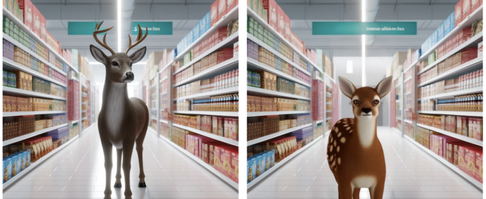 Here’s another example, in which I asked for a deer in a grocery store, and then asked for the deer to be a fawn instead. By revision 5 (trying to give the fawn spots, trying to fix the shadows that were making it appear to hover), both the quality of the deer and the grocery store background have deteriorated.