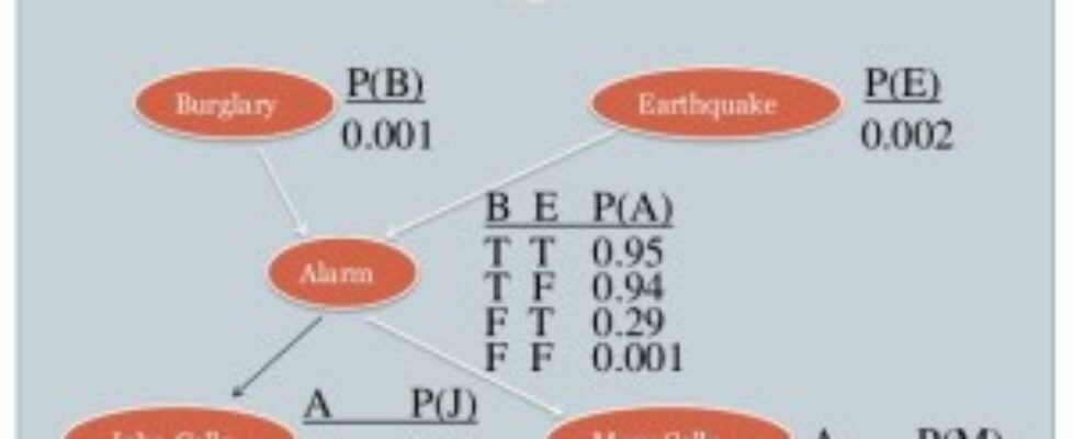 - The conditional probabilities of any other node given every value-combination of its parent(s). For example, the table next to Alarm defines the probability that the Alarm will go off given the whether an Earthquake and/or Burglary have occurred.