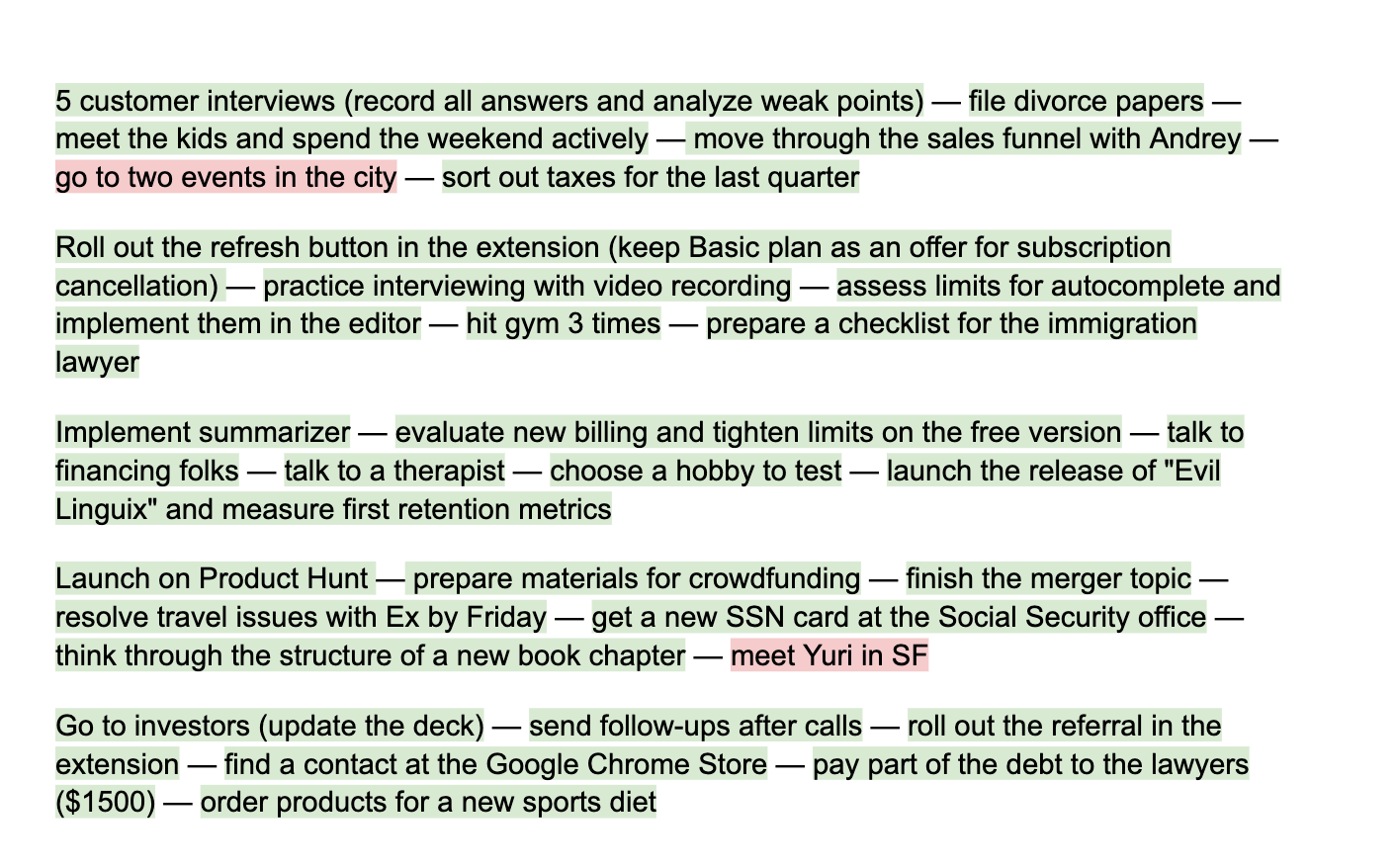 - Context over Chronology. In a calendar, it’s hard to list the nitty-gritty details of payments to different contractors or a step-by-step EB-1 visa plan. In a Doc, these are just a few lines that are always at my fingertips.