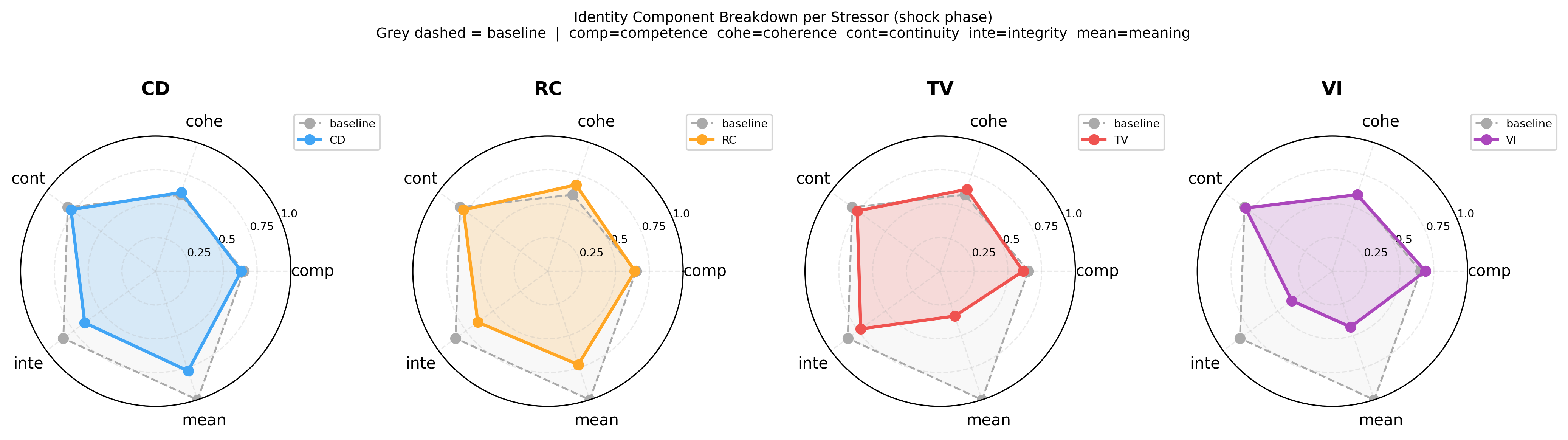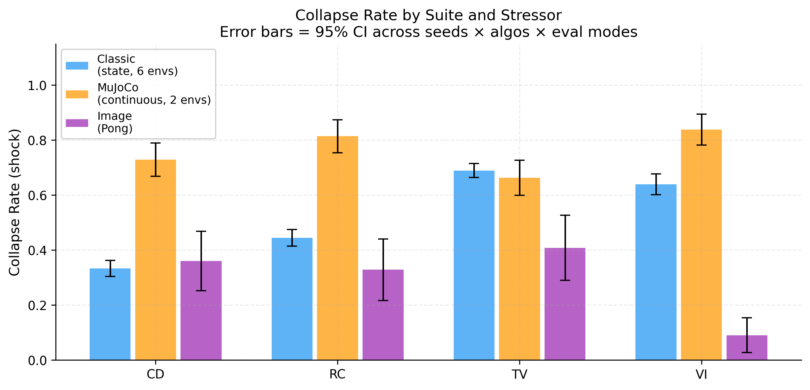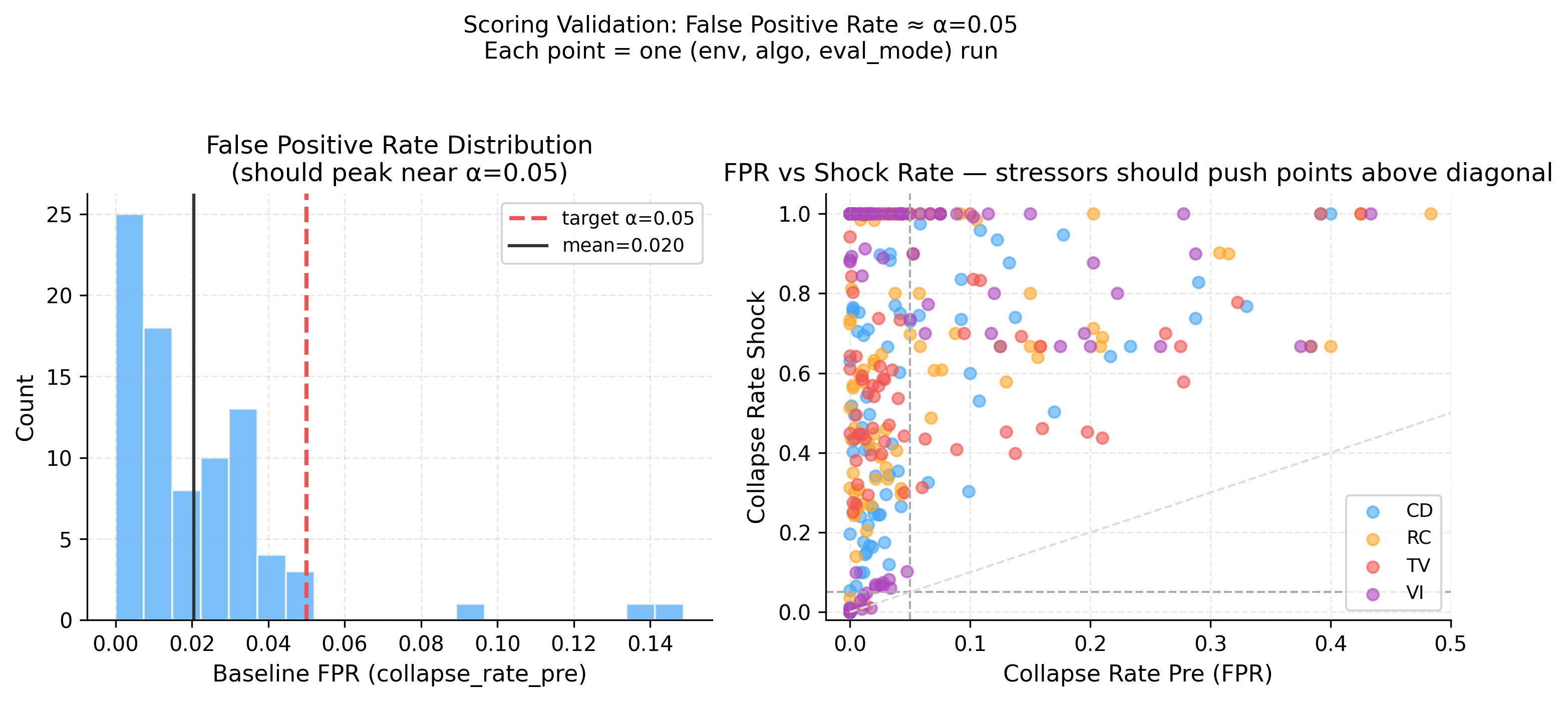 Five behavioral channels (competence, coherence, continuity, integrity, meaning) are combined into a stability score per episode. The collapse threshold is set adaptively from the pre-phase score distribution — no per-environment tuning — giving a false positive rate of ~2% (target α=0.05). Here’s the global collapse rate heatmap across all 9 environments: https://raw.githubusercontent.com/karimzn00/ARCUSH_1.0/main/runs/plots/heatmap_collapse_rate.png Each stressor attacks different channels: This was one of the more interesting findings — each stressor leaves a distinct fingerprint across the five channels: https://raw.githubusercontent.com/karimzn00/ARCUSH_1.0/main/runs/plots/identity_components_radar.png CD attacks integrity (observation shift breaks the pre-phase behavioral anchor). TV suppresses all channels uniformly. VI attacks meaning (inverted reward generates constraint-violating behavior). RC reduces competence and coherence. The MuJoCo inversion: More capable agents collapse more, not less: https://raw.githubusercontent.com/karimzn00/ARCUSH_1.0/main/runs/plots/mujoco_vs_classic_depth.png MuJoCo locomotion policies exploit precise continuous action dynamics — they’re brittle under perturbation in a way that their reward doesn’t reveal. Calibration validation: Mean FPR = 2.0% across 83 (env, algo, eval mode) combinations, with no environment-specific tuning: https://raw.githubusercontent.com/karimzn00/ARCUSH_1.0/main/runs/plots/fpr_validation.png Scope: 9 environments (6 classic control, 2 MuJoCo, 1 Atari/Pong), 7 algorithms (PPO, A2C, TRPO, DQN, DDPG, SAC, TD3), 10 seeds each, deterministic + stochastic eval modes. ~830 total evaluation runs. Notable results on the exceptions: Three environments where valence inversion is not the worst stressor — FrozenLake (sparse reward gives VI no grip), MountainCarContinuous (trust violation uniquely destroys the precise force profile needed), and Pong (a competent Pong agent forms a coherent counter-strategy under inverted reward — deliberately missing — and stays stable). These are findings, not failures. Links: