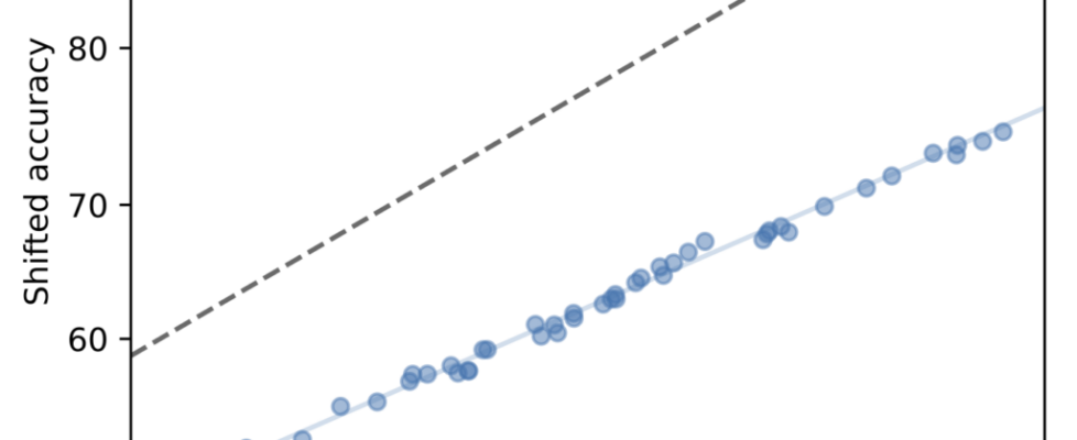 It turns out that different models trained from scratch (with different architectures, hyperparameters, etc.) often exhibit a strong linear relationship between their accuracies on the reference and shifted distributions.