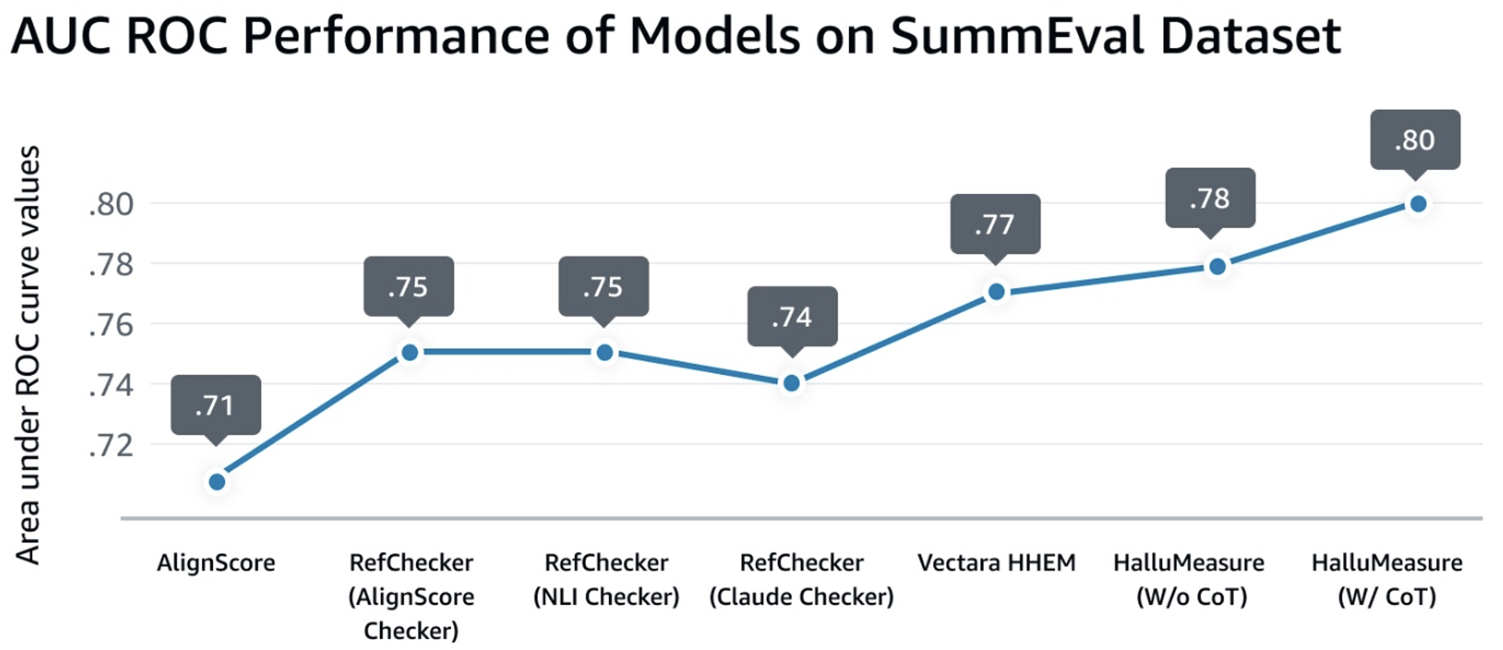 Once implemented, we compared HalluMeasures performance against other available solutions on the popular SummEval benchmark dataset. The results clearly demonstrate improved performance with few-shot CoT prompting (2 percentage points, from 0.78 to 0.8), taking us one step closer to the automated identification of LLM hallucinations at scale.