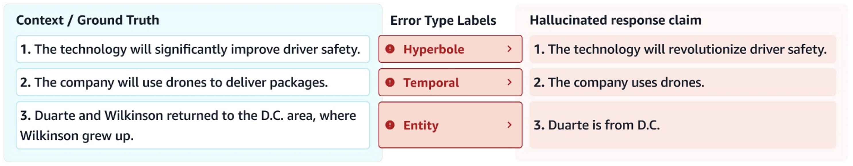 Additionally, understanding the distribution of error types across an LLMs responses allows more-targeted hallucination mitigation. For example, if a majority of wrong claims contradict a particular assertion in the context, a common cause say, allowing a large number (e.g., >10) of turns in a dialogue could be explored. If fewer turns decrease this error type, restricting the number of turns or using summaries of previous turns could mitigate hallucination.