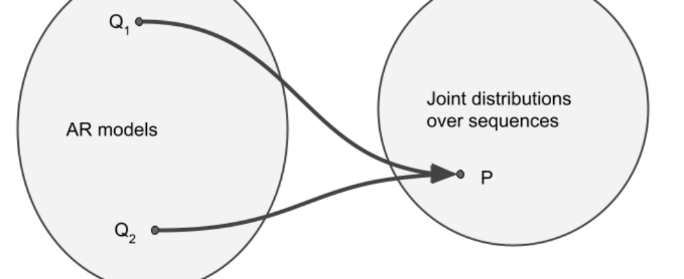 In my head, I considered there to be a 1-to-1 mapping between autoregressive models (a family of conditional probabilities ${p(x_nvert x_{1:n-1}), n=1ldots N}$) and joint distributions over sequences $p(x_1,ldots,x_N)$. However, I now understand that is, generally, a many-to-one mapping.