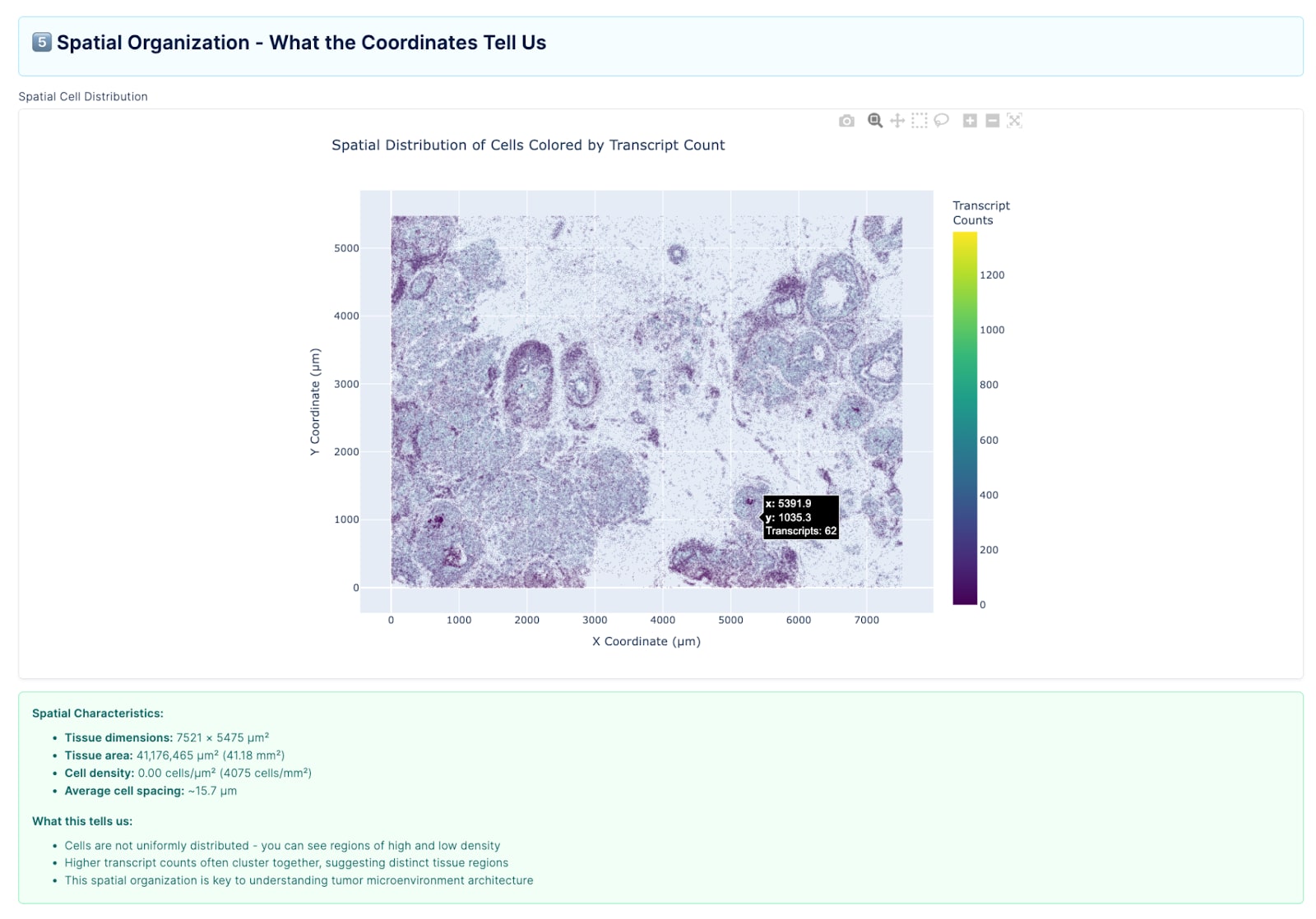Before we could evaluate the agent, we needed to understand the data ourselves. Most of what we worked with came from 10x Genomics spatial transcriptomics datasets, primarily Xenium FFPE (formalin-fixed paraffin-embedded) human breast cancer samples, with some Visium data mixed into the same directories. Xenium is an in situ transcriptomics platform that provides subcellular-resolution gene expression measurements across a targeted panel of several hundred genes, while Visium captures whole-transcriptome data at spot-level resolution. Both are spatially resolved, but they differ significantly in gene panel size, resolution, file structure, and the analytical approaches appropriate for each.