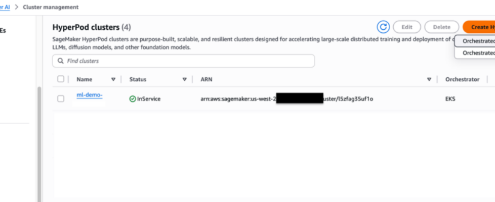 To create a HyperPod cluster with Amazon Elastic Kubernetes Service (Amazon EKS) orchestration, navigate to the SageMaker HyperPod Clusters page in the Amazon SageMaker AI console.