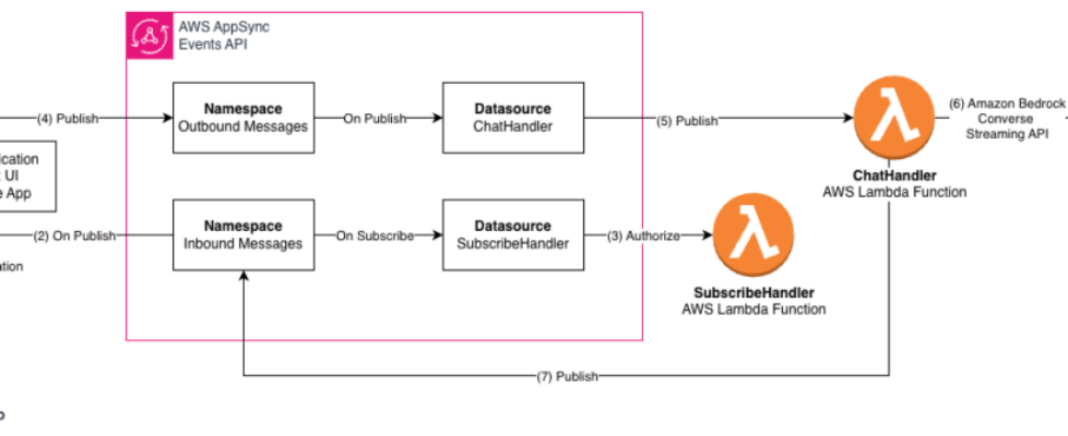- The client application subscribes to the AppSync Events channel, from which it will receive events like streaming responses from the LLMs in Amazon Bedrock.