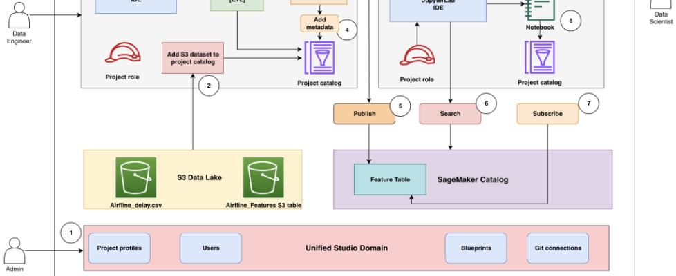This blog post provides step-by-step guidance on implementing an offline feature store using SageMaker Catalog within a SageMaker Unified Studio domain. By adopting a publish-subscribe pattern, data producers can use this solution to publish curated, versioned feature tables—while data consumers can securely discover, subscribe to, and reuse them for model development. The approach integrates Amazon S3 Tables with Apache Iceberg for transactional consistency, AWS Lake Formation for fine-grained access control, and Amazon SageMaker Studio for visual and code-based data engineering.
