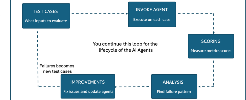 Each of these definitions directly determines what your evaluation system measures and getting them wrong means optimizing for the wrong outcomes. Without this foundational work, the gap between what teams hope their agents do and what they can prove their agents do becomes a real business risk.Bridging this gap requires a continuous evaluation cycle, as shown in Figure 1. Teams build test cases, run them against the agent, score the results, analyze failures, and implement improvements. Each failure becomes a new test case, and the cycle continues through every iteration of the agent.