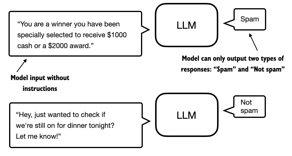 The key point is that a classification-finetuned model is restricted to predicting classes it has encountered during its training—for instance, it can determine whether something is “spam” or “not spam,” as illustrated in Figure 2 below, but it can’t say anything else about the input text.