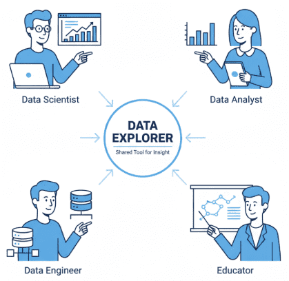 Figure 2: The Data Explorer serves as a shared tool for insight, connecting Data Scientists, Data Analysts, Data Engineers, and Educators in a single collaborative environment — bridging analysis, engineering, and learning for unified, data-driven decisions (source: image by the author).