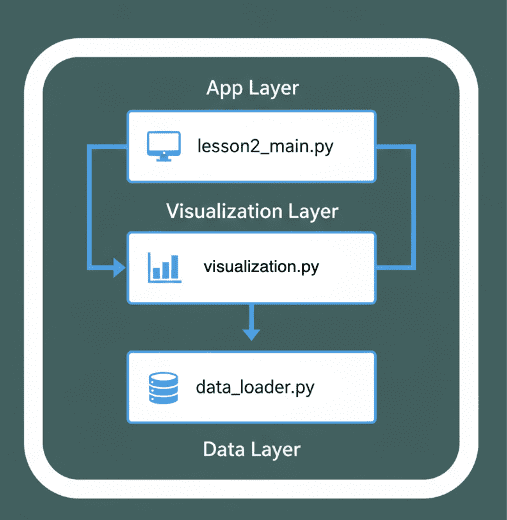 Before diving into lesson2_main.py, let’s revisit the lightweight helper modules that quietly power the app. These modules keep the main Streamlit file clean and modular, separating concerns between configuration, data access, and visualization.