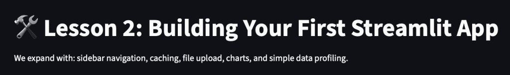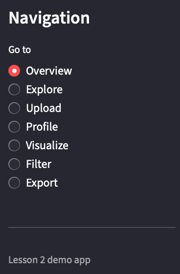 By structuring the app as distinct pages (Overview → Explore → Upload → Profile → Visualize → Filter → Export), you’ll also build a mental model for scaling Streamlit apps in later lessons.