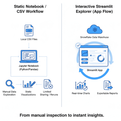 Figure 1: A visual comparison between traditional data analysis using static Jupyter notebooks and CSV files versus an interactive Streamlit-based workflow connected to a Snowflake data warehouse. The left side highlights the limitations of manual data exploration and static visualizations. In contrast, the right side showcases real-time charts, exportable reports, and dynamic insights — illustrating the evolution “From manual inspection to instant insights” (source: image by the author).