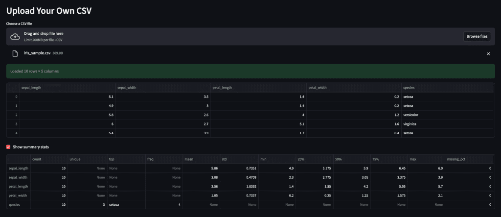 Figure 11: Screenshot showing the Upload page after a CSV has been loaded, with a success banner at the top, a table preview below, and the “Show summary stats” checkbox expanded with the summary table visible (source: image by the author).