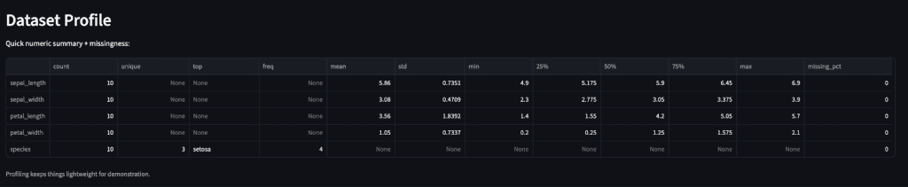 Figure 12: Screenshot of the Profile page showing the descriptive stats table with columns (e.g., mean, std, and missing_pct), plus a caption below (source: image by the author).